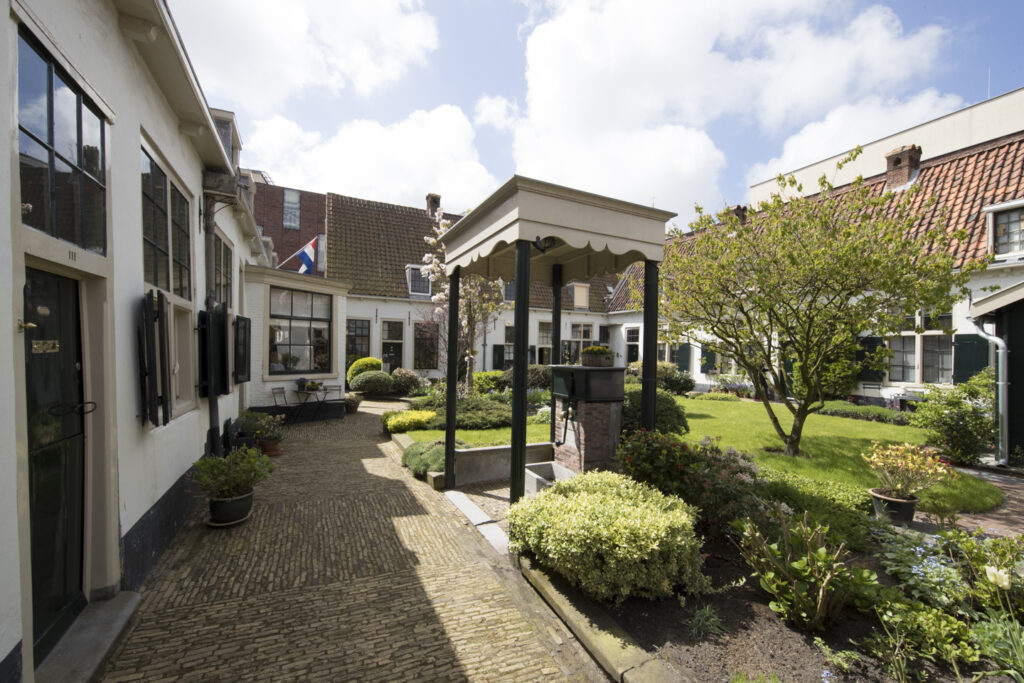Geeft u uw toelichting s.v.p. buiten het hofje; er is voldoende ruimte in de Wijde Appelaarsteeg voor de poort aldaar. Ga niet naar binnen door de poort aan de Wijde Appelaarsteeg. Deze ingang is voor bewoners en leveranciers. Loopt u s.v.p. naar de bezoekersingang aan de Bakenessergracht.